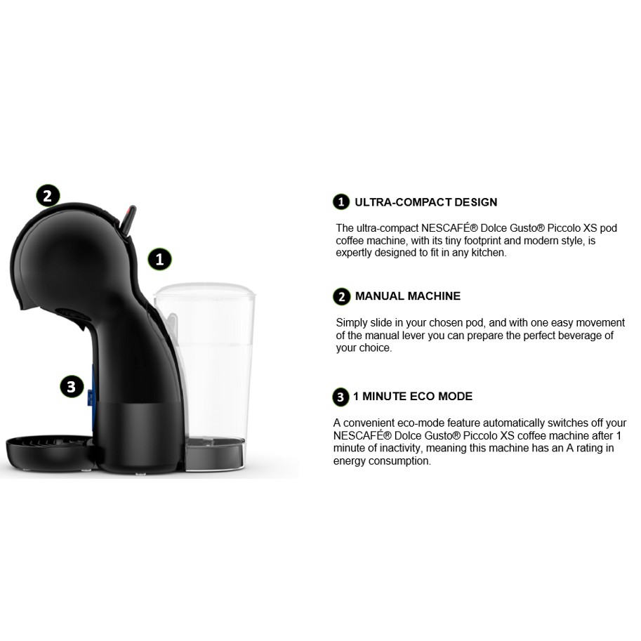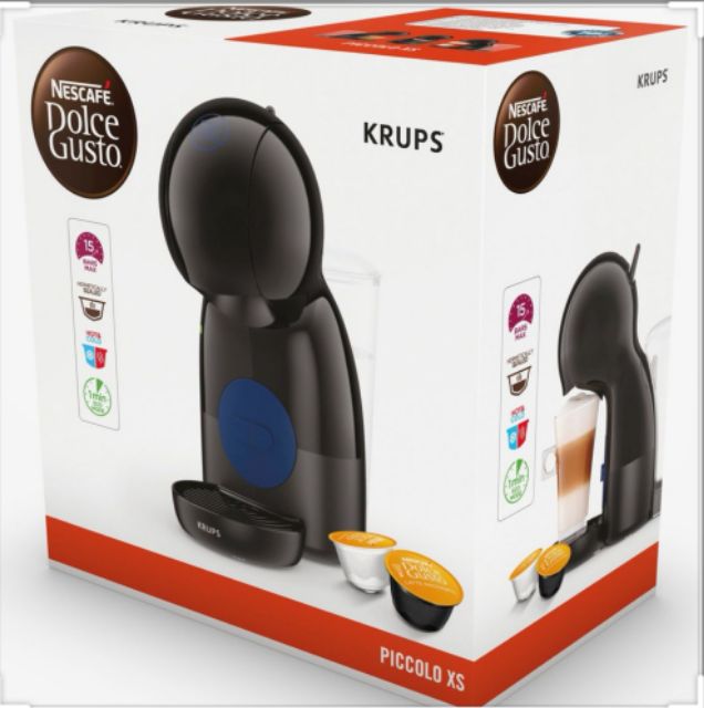 Piccolo xs black the extra small nescafé dolce gusto piccolo xs capsule coffee machine with its tiny footprint and modern style is expertly designed to fit in any kitchen. The piccolo by krups coffee pod machine is only 14cm wide x 28cm height x 27cm deep and available in white. Whilst the maximum 15 bar pump pressure means the perfect cup of coffee can be created every time. It s just as capable as bigger.