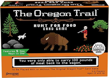 108 hunting cards 20 supply cards 6 dice 12 bullet tokens 1 hunter playing piece 1 mover stand complete instructions 4 retro coasters just for fun. Hunt for food card game challenges 2 6 players to find enough food to keep them alive during their travels six hundred pounds of food to be precise. Not all of you might live while tracking down this food but ideally at least one of you will make it to the end of the trail with a full belly. This game can be played as a standalone game or as an expansion of the original oregon trail game described above.