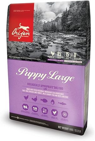 Orijen puppy large provides more calories from protein and fat and fewer from carbohydrates providing a calorie distribution that mirrors the natural puppy diet. Orijen puppy is formulated to meet the nutritional levels established by the aafco dog food nutrient profiles for all life stages including for growth of large size dogs 70lb or more as an adult. With 38 richly nourishing protein and 85 quality animal ingredients orijen nourishes large breed puppies according to their evolutionary and biological needs. We think you ll love orijen.