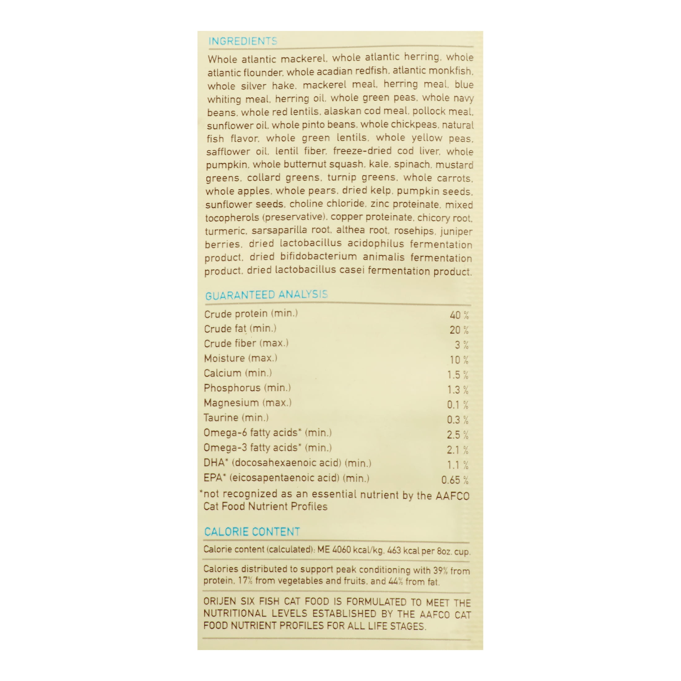 Metabolizable energy is 3530 kcal kg 402 kcal per 8oz. Me 3900 kcal kg 445 kcal per 8oz. Orijen six fish provides more calories from protein and fat and fewer from carbohydrates providing a calorie distribution that mirrors the natural diet reducing the risk of obesity and diabetes. Metabolizable energy is 4120 kcal kg 535 kcal per 250ml 130g cup with calories distributed to support peak conditioning.