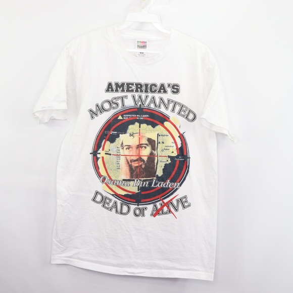 Osama bin laden dead or alive t shirt. The tag was previously cut. This funny tshirt ships via usps. According to snowden not only is bin laden still alive but he is living a lavish lifestyle in the bahamas thanks to regular payments from the cia. Maurice harary 23 set up his t shirt website.